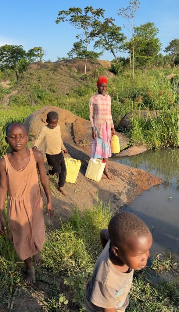 În fiecare zi, copiii merg desculți până la baltă cu bidoanele goale. Le cară în mâini sau sprijinite pe cap și aduc acasă apa pe care o vor bea.